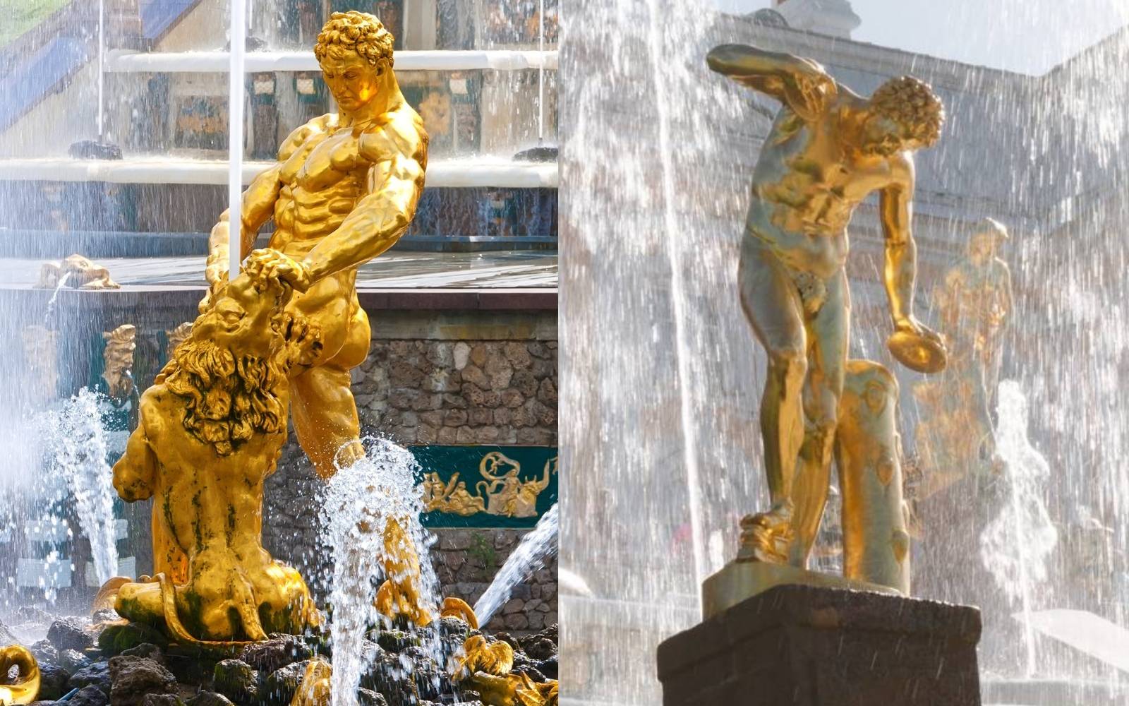 В Петергофе работает более 150 фонтанов и каскадов. Центральной фигурой каскада является фонтан «Самсон, разрывающий пасть льва». Скульптура изображает библейского героя Самсона в момент схватки со львом — символическую аллегорию победы России над Швецией в Северной войне. Лев в этом сюжете олицетворяет Швецию, а Самсон — силу и торжество российской державы. Из пасти льва вырывается мощная струя воды, поднимающаяся на высоту более 20 метров, что делает этот фонтан самым высоким в Петергофе. Вокруг Самсона расположены фигуры тритонов, дельфинов и аллегорических персонажей, усиливающих динамику и торжественность композиции.