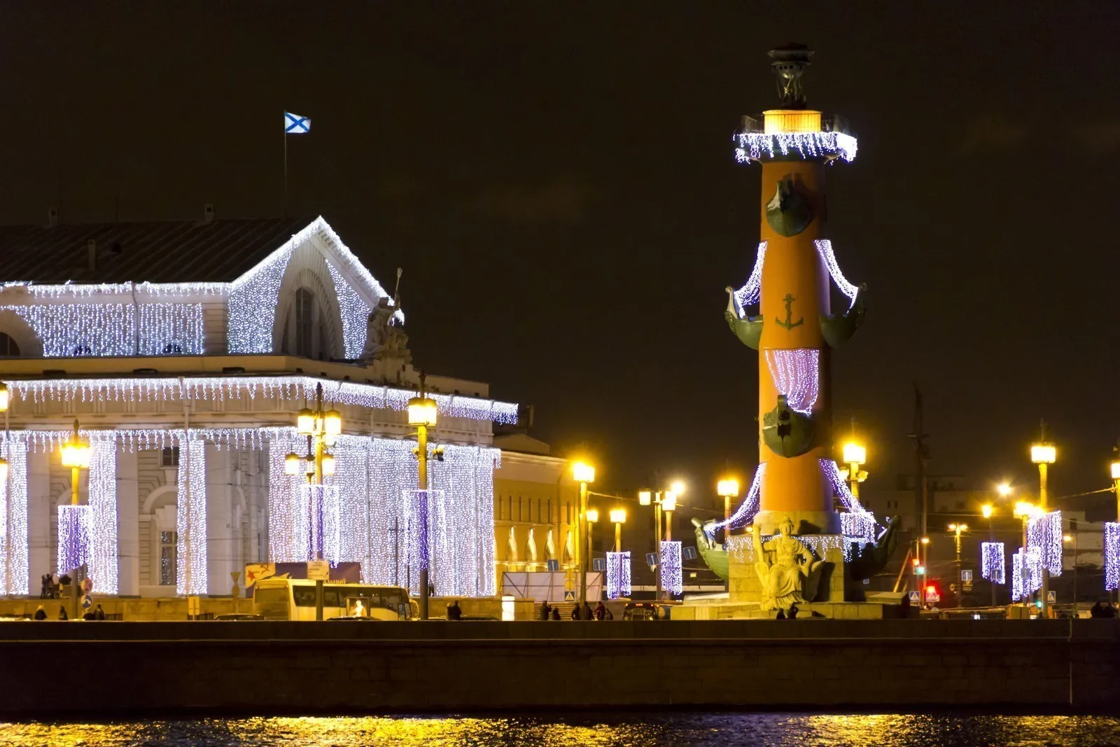 - Стрелка Васильевского острова - лучший вид на Дворцовую и ростральные колонны, которые в новогодней подсветке выглядят как открытка.