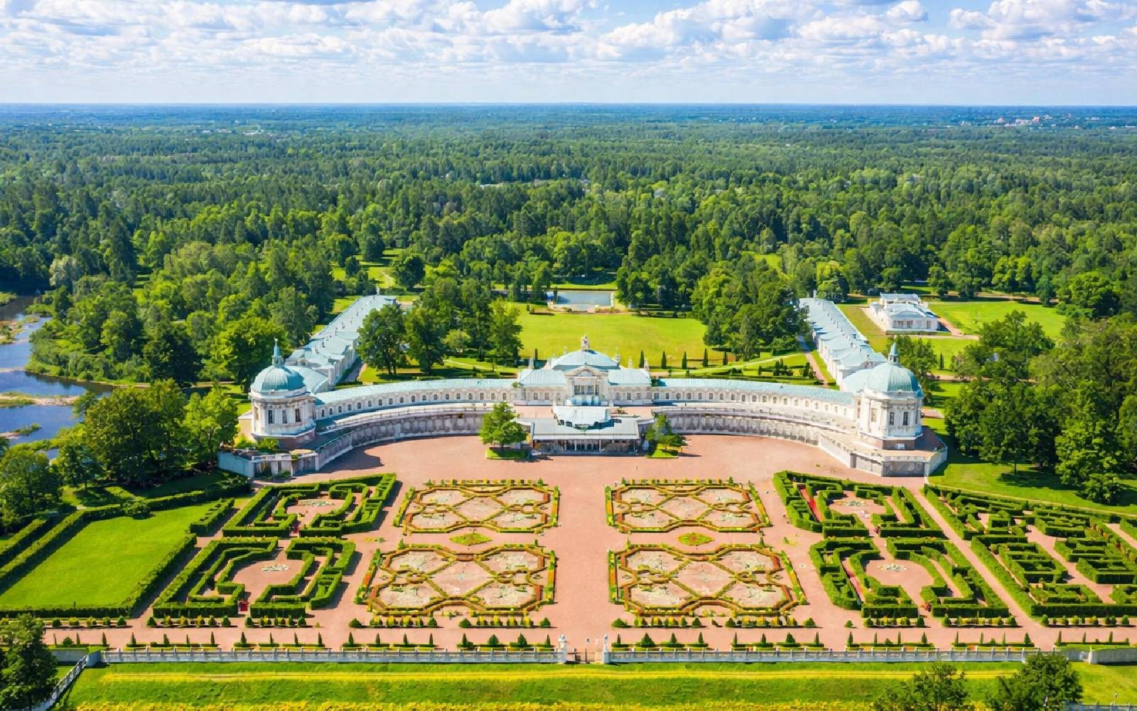 Дворец возвышается на прибрежном холме и словно парит над окрестностями. Его центральная часть увенчана княжеской короной, а два крыла, выполненные в виде галерей, ведут к восточному и западному флигелям, образуя парадный курдонёр. В разное время хозяевами Ораниенбаума были князь Меншиков, император Петр III и императрица Екатерина II, оставившие свой след в истории и облике резиденции.