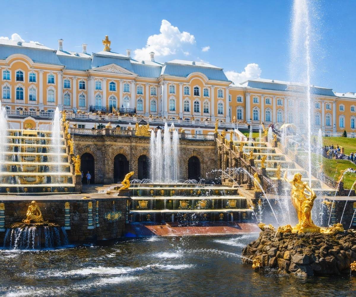 в загородную парадную резиденция российских императоров на территории 400 гектар включающую в себя 150 фонтанов, 4 каскада, парки, сады и дворцы с выходом к морю