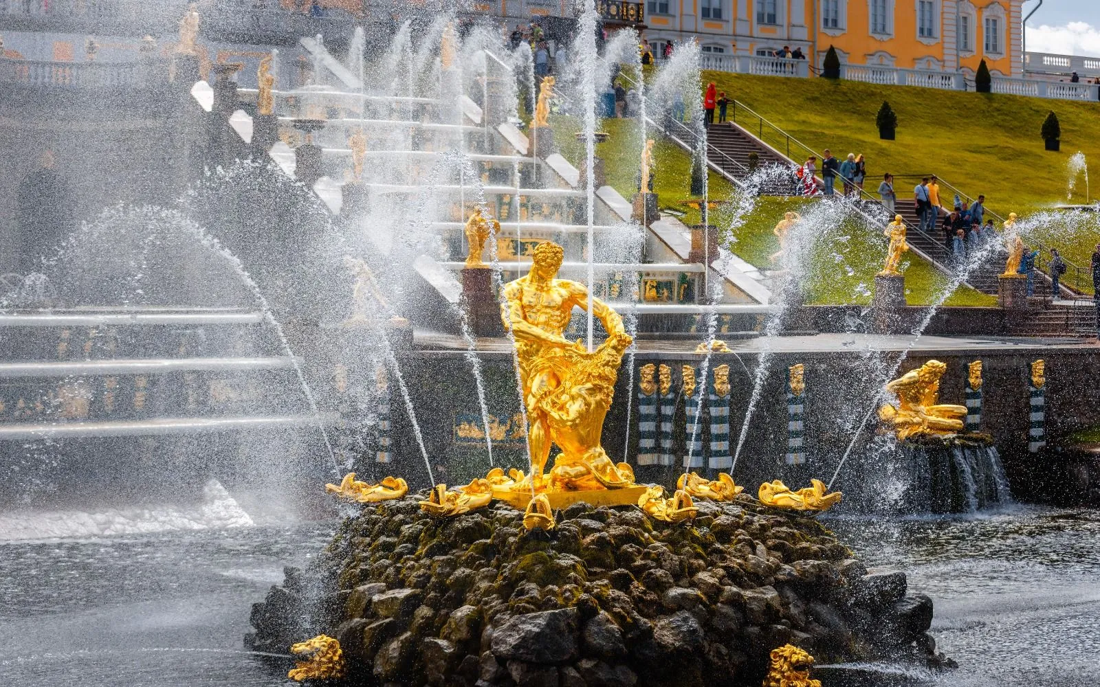 - Нижний парк (Большой каскад, фонтан «Самсон», дворец Монплезир, фонтаны-шутихи, Римские фонтаны, выход к Финскому заливу)