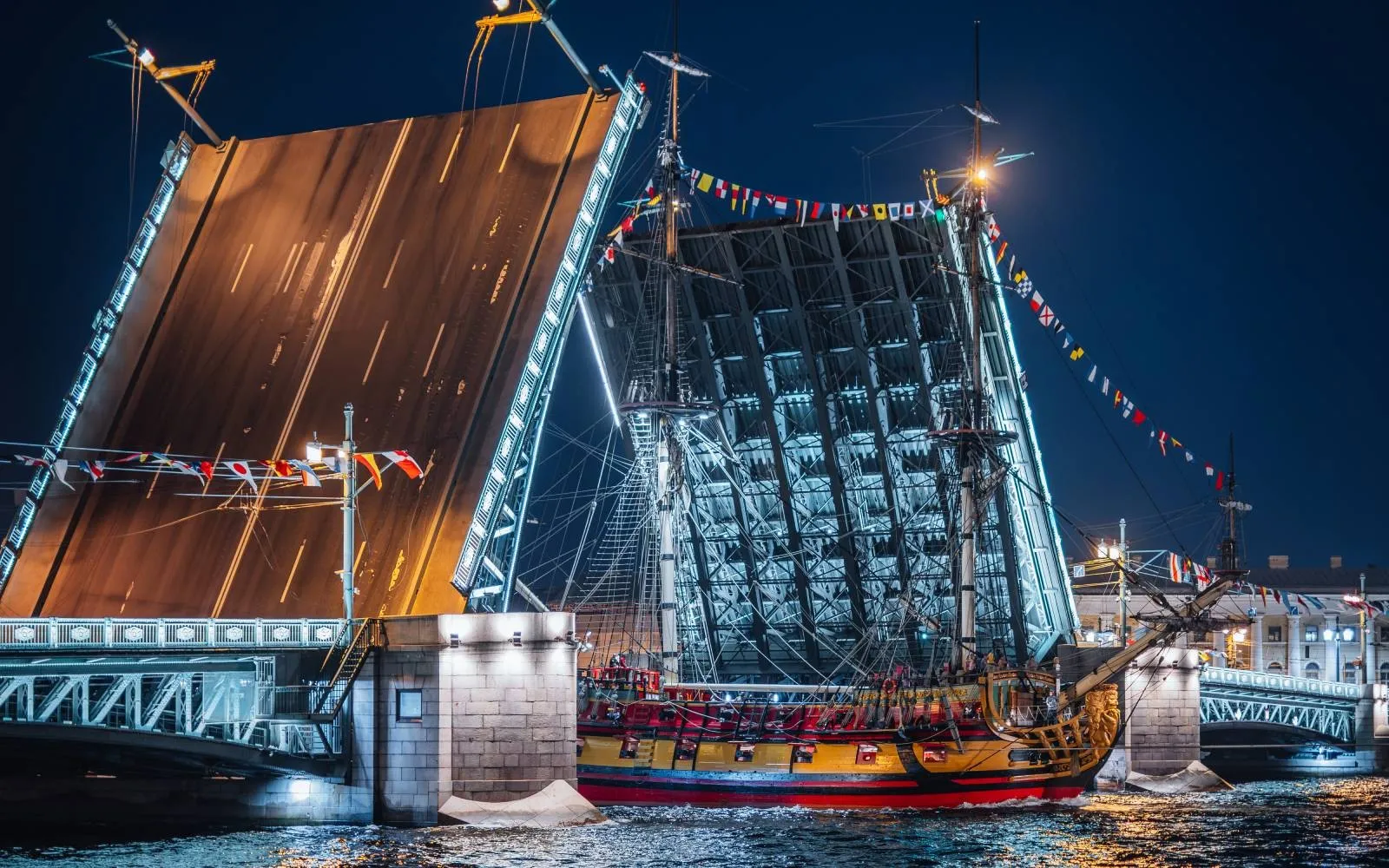 Кульминацией прогулки становится развод Дворцового и Троицкого мостов — главное ночное событие города. Пролёты мостов поднимаются под светом фонарей, открывая путь кораблям и создавая уникальную атмосферу. После этого теплоход продолжает движение по Неве и возвращается к каналам, где можно спокойно насладиться завершением маршрута. На борту доступны открытая и закрытая палубы, а аудиогид или гид экскурсовод сопровождает всю поездку.